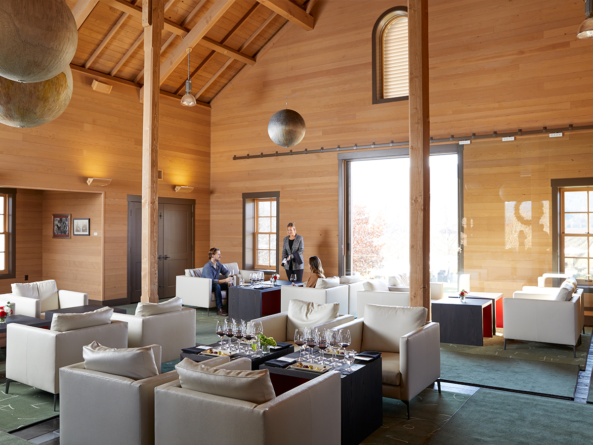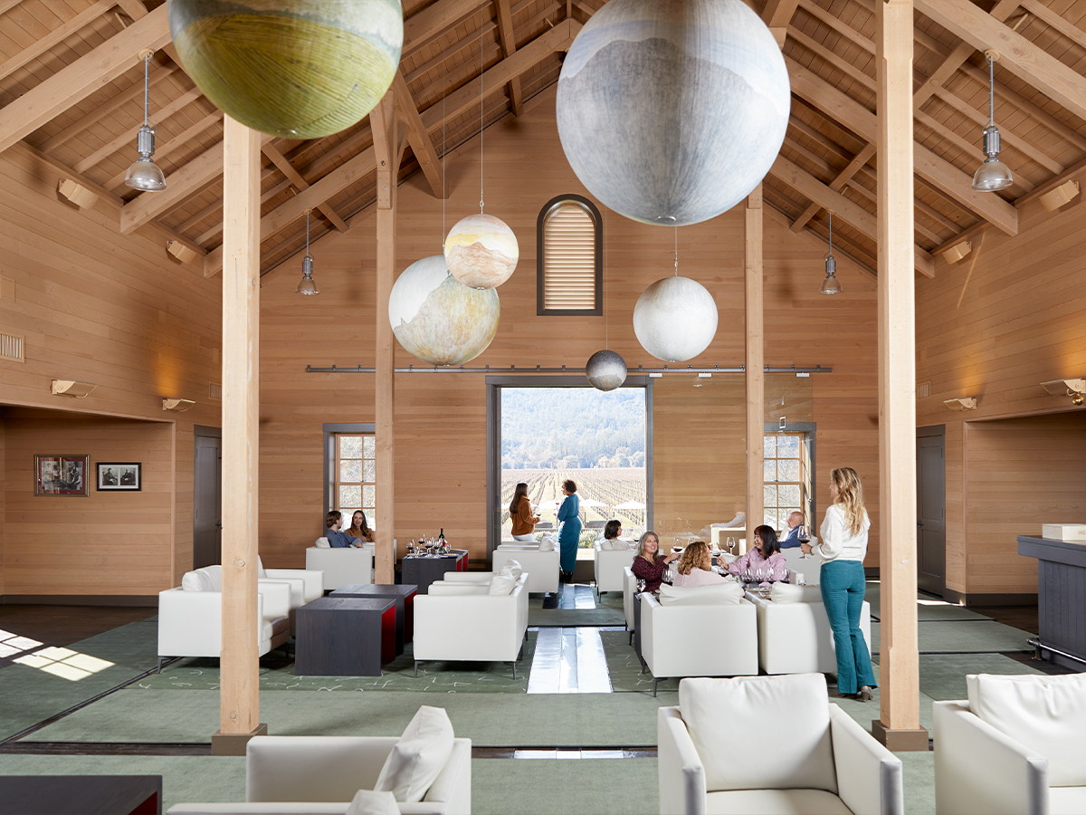 The atmosphere is striking and modern, especially at the St. Helena winery, where large-scale art pieces and clean architectural lines set the tone. Outdoor spaces are polished and inviting, and indoor tasting areas feel airy and intentional. It’s upscale and visually stimulating, but still relaxed enough that you don’t feel out of place asking questions or lingering over a glass.