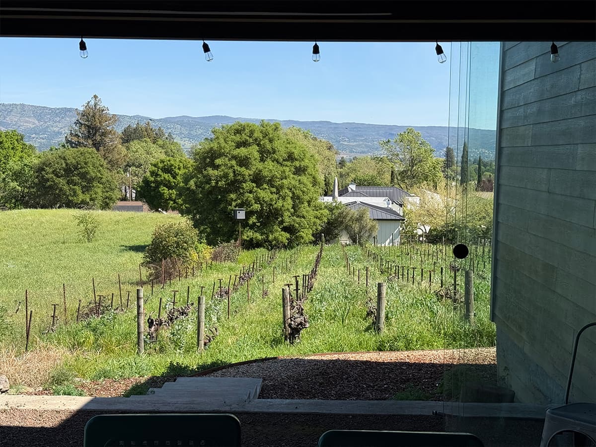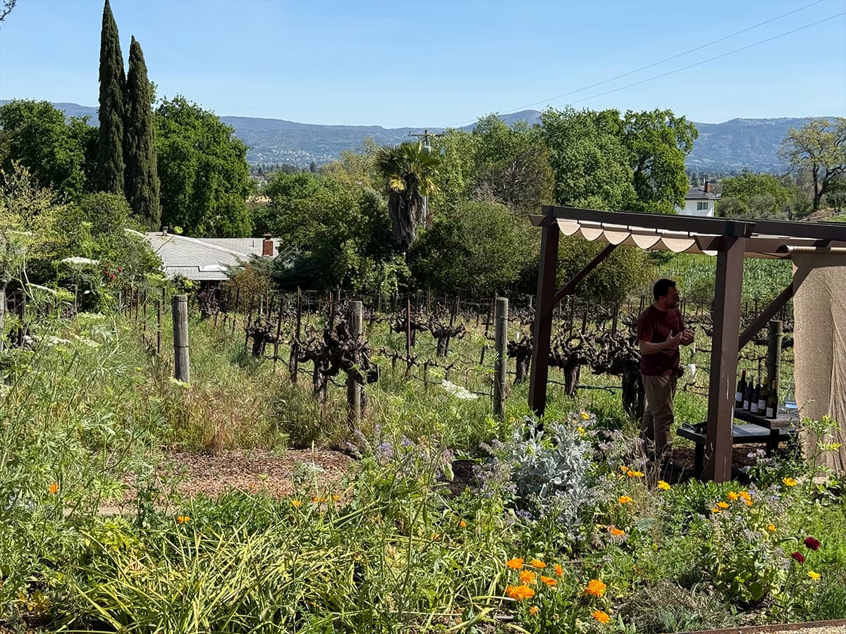 The tasting space is outdoors, set up at picnic tables in the vineyard with a view across the valley toward the Mayacamas. There’s no grand winery building or polished hospitality center. It’s a working farm, with the production facility tucked nearby and Jill’s fruit trees and gardens woven through the property. The vibe is unhurried and genuinely agricultural. Dogs wander, birds work the hedgerows, and the whole setting feels more like a friend’s farm than a destination winery.